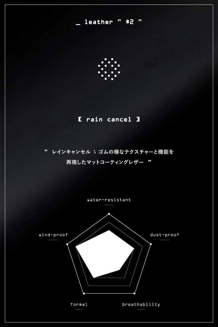 #2 レインキャンセル : ゴムの様なテクスチャーと機能を再現したマットコーティングレザー。